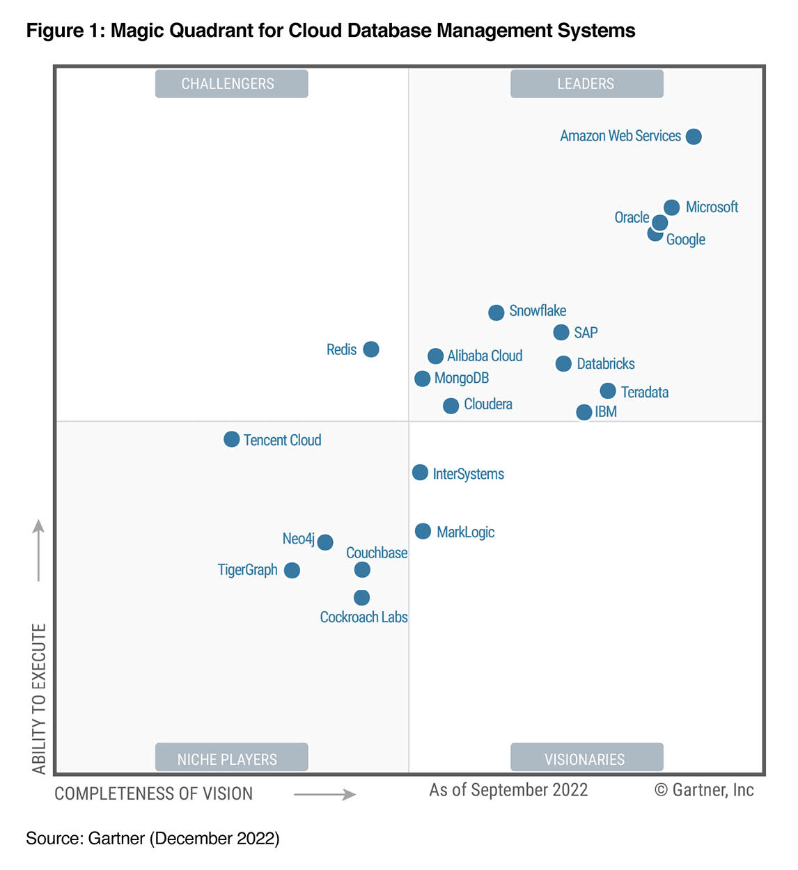 Quadrant for Cloud Database Management Systems (CDBMS). Gartner does not endorse any vendor, product or service depicted in its research publications and does not advise technology users to select only those vendors with the highest ratings or other designation. Gartner research publications consist of the opinions of Gartner’s research organization and should not be construed as statements of fact. Gartner disclaims all warranties, expressed or implied, with respect to this research, including any warranties of merchantability or fitness for a particular purpose.